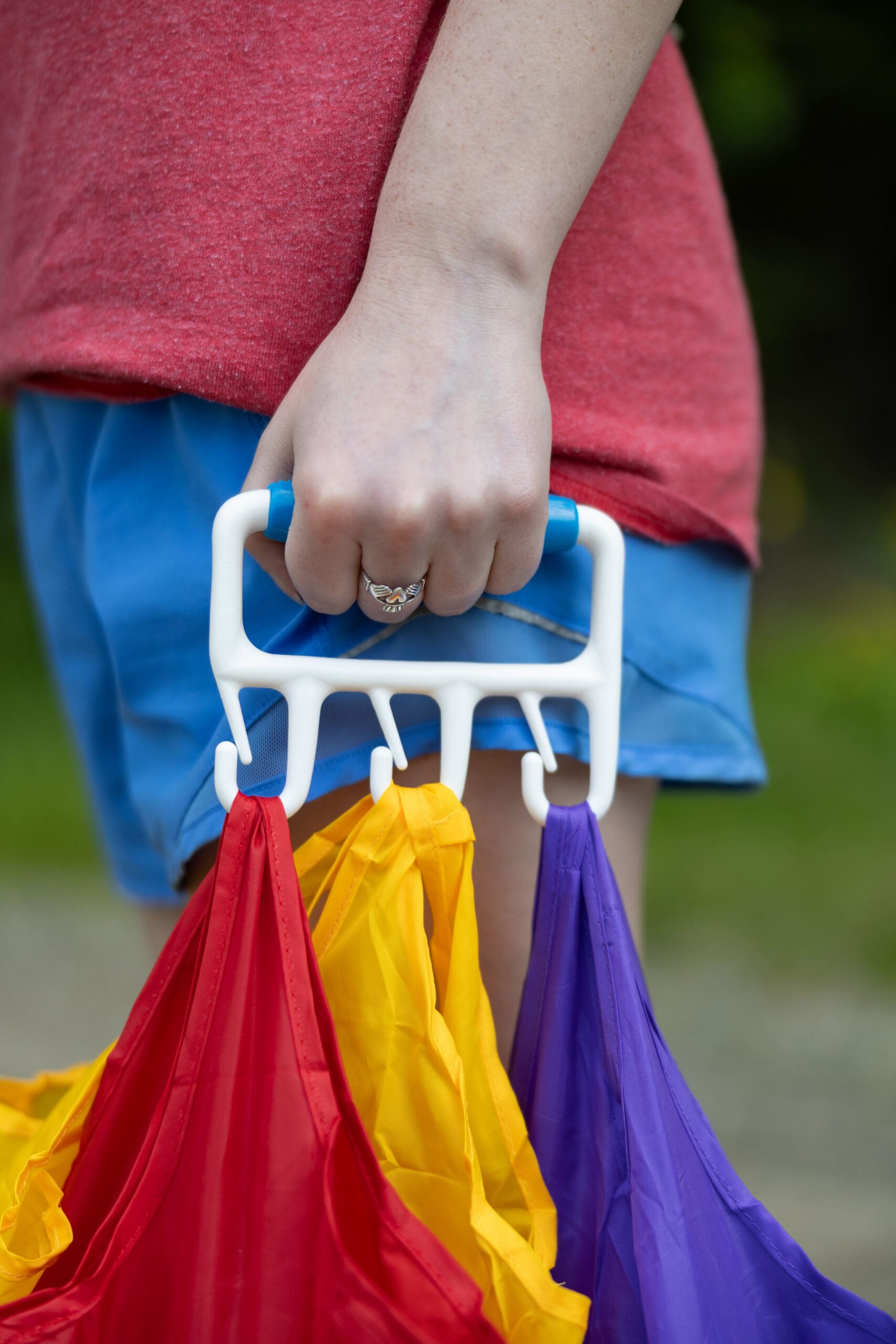 The BAGGLER® is designed to slide your thin handle cloth, rope handle, and plastic shopping bags on and off with the least effort. There are two primary components that contribute to the remarkable ease with which plastic bags slide on and off. First, The BAGGLER® is made of a smooth, almost frictionless copolymer, and latex-free. The copolymer has tremendous memory, and the tines and hooks retain their position but have enough flexibility to allow nearly all plastic bags to slide on and off. Second, the precise design of the hooks and tines keeps your plastic bags from getting snagged. A slight overlap of 3/16″ and a smooth rounded tip creates a “V” like channel, allowing you to remove each bag handle easily. You don’t have to move the tines; they are flexible enough to allow the bag handles to slide through and off the hooks.